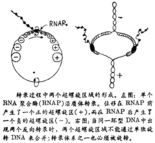 当你走到窗前,顺时针方向旋转拉窗帘的双股绳子,使长到足以获得一个双螺旋,然后在两股绳子之间插入一支笔,并向前推动笔而不旋转,你这就是在制作一个转录过程的机械模型:笔或者RNA聚合酶沿着DNA(即相互卷曲的双链)移动。从此实验中可以看到,当RNA聚合酶移位时,将会使它前面的DNA卷得过紧,而后面的DNA不足卷曲。换句话说,DNA在RNA聚合酶前成为正的超卷曲,而在后成为负的超卷曲(见图)。虽然是DNA螺旋结构的必然结果,但这个随RNA聚合酶移动的超螺旋波似乎是幻想的,然而,王 · J. C. 及其合作者最近所做的漂亮实验证实了这些超螺旋波实际上在原核和真核细胞中都存在。这些数据将无疑会改变对DNA超螺旋的学意义及DNA拓扑学重要性的一般态度。