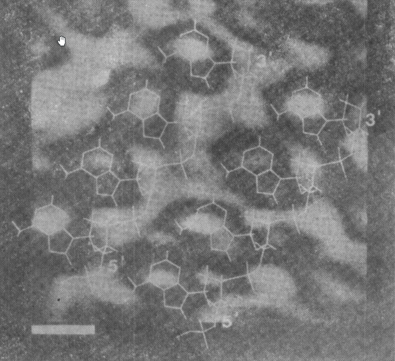 图为构成我们人体细胞基因遗传密码的单个碱基。美国新墨西哥州的两位科学家用扫描隧道显微镜首次获得清晰的单个碱基照片。照片的轮廓纸示出双股多脱氧腺苷酸中碱基的位置。这两位科学家的工作为在实验室中用化学方法测定人类基因组顺序提供了便利。