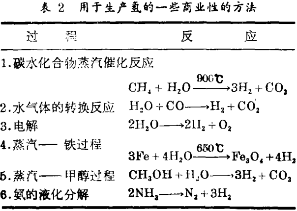 不同于天然气和原油,氢在自然界不呈游离态,因此不能看作是一种初级的能源。它作为一种能量的携带者,犹如电力,必须被制造出来。全世界每年大约有300亿立升的氢用各种化学方法生产出来(表2),氢也具有许多工业上的用途,用来生产肥料、染料、药品和塑料,用于油类和脂肪的氢化、煤转化为汽油和生产甲醇,作为一种直接的能源,氢用于航天项目作动力火箭的燃料以及在称作燃料电池的装置中发生电力。几种大规模的燃料电池已在美国试验,在东京一座4.6兆瓦的燃料电池动力工厂已成功地作业而无污染。