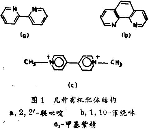 最近,对一些含有有机配体的改变的金属化合物的研究指出它们作为光敏剂 - 化合物的巨大潜力。这些配体如联吡啶,菲绕啉(图1),有机颜料即卟啉。它们能吸收光并能形成高能量的物质,具有巨大的能量来分离水。这种类型中得到最广泛研究的化合物是三(联吡啶)钌(Ⅱ)离子,Ru(bpy)32+。此合成物的性质使其成为一种有吸引力的已激发状态的电子转移反应的候选者。其性质是(1)在其正常四氧化状态下,其在水溶液中一般是稳定的,并不历经配体的光分离作用;(2)在太阳的可见光谱范围内它具有大的光分子吸附能力;(3)随着光的吸收,最低的激发状态在溶液中展示室温发射;(4)最低激发状态的持续时间对于允许在电子转移反应中此激发状态的参与一般是足够的。