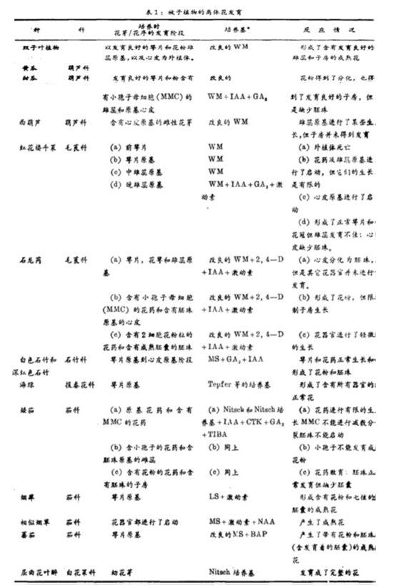 到目前为止,已有近30余种植物体的花芽和幼花序进行了体外培养的尝试,但是对不同的花系统来说,所培养的芽发育阶段及所使用的基本培养基却是有区别的(见表1)。