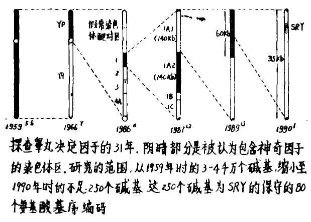 1959年,最早发现决定小鼠和人类雄性的因子是Y染色体。几年以后,研究的目标缩小到Y染色体的一个短臂上面。发现了一个高度保守的,重复DNA顺序,与蛇的性别有关,而且是集中在小鼠的Y染色体上面。于是产生了许多假说,推测这个顺序可能起到决定性别的作用。但结果证实,这一顺序并不出现在人的Y染色体上面,因而研究者们对其失去了兴趣。约10年时间里,理论推测雄性特有的组织亲合性抗原H - Y,对诱发睾丸的形成起主要作用,在哺乳动物中,一旦性腺定型形成睾丸,雄性便随之出现。但是,发现具有睾丸的小鼠,却没有H - Y抗原。这样一来,这种理论也遭到了否决。