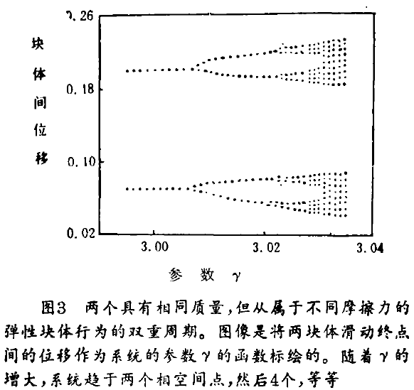 1990年,黄捷(Jie Huang)和图科特(Donald Turcotte)采用实质上和纽斯鲍姆、瑞纳同样的模型,但是允许作用在一个块体上的摩擦力大于另一个(比例系数为β),利用这个不对称性,黄和图科特获得了决定论的混沌行为的证据。他们分析时,首先显示系统在相空间的连续状态,并图绘比较两块体的位置。展现的轨道绝非如人们期待的那样,定于某一个或有限数目的点上,如果系统接近稳态或周期性行为,而是充满了相空间图。而且,系统呈现沿着双重周期路线、趋于混沌的现象:随着描述摩擦随速度变化的参数γ的增大,系统先是演变成单一的相空间点;然后当参数继续增大时,系统在两个终态之间振荡;接着4个状态、再后8个,等等(见图3)。