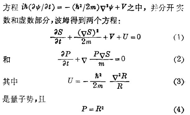 他在“依据‘隐’变量对量子理论的一个建议性诠释”一文中,发表了他的新方法,在现代物理思想中开创了最激动人心的一章。把波函数ψ表示为Rexp(iS/h),其中R和S是实函数,将这个表示代入薛定谔