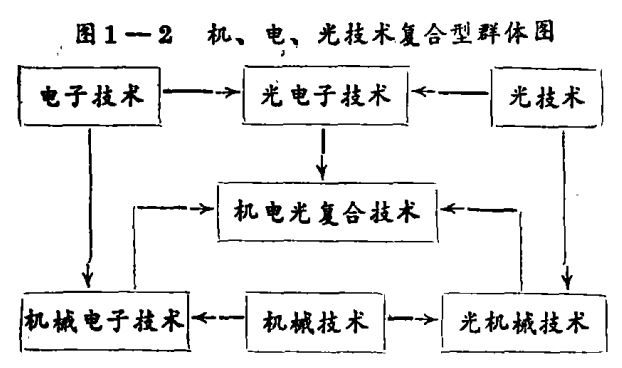 1. 复合型群体。由两种或两种以上的技术复合后形成,复合产生的信息技术与参加复合的源'技术构成了一个技术群体。这种群体的构成如果用图表示可以是网状结构。如电子技术、计算机技术、机械技术、光技术复合化产生的新信息技术,结果产生了机械电子技术,光电子技术及光机械技术,从而使机器具备了智力功能。如图1-1所示。