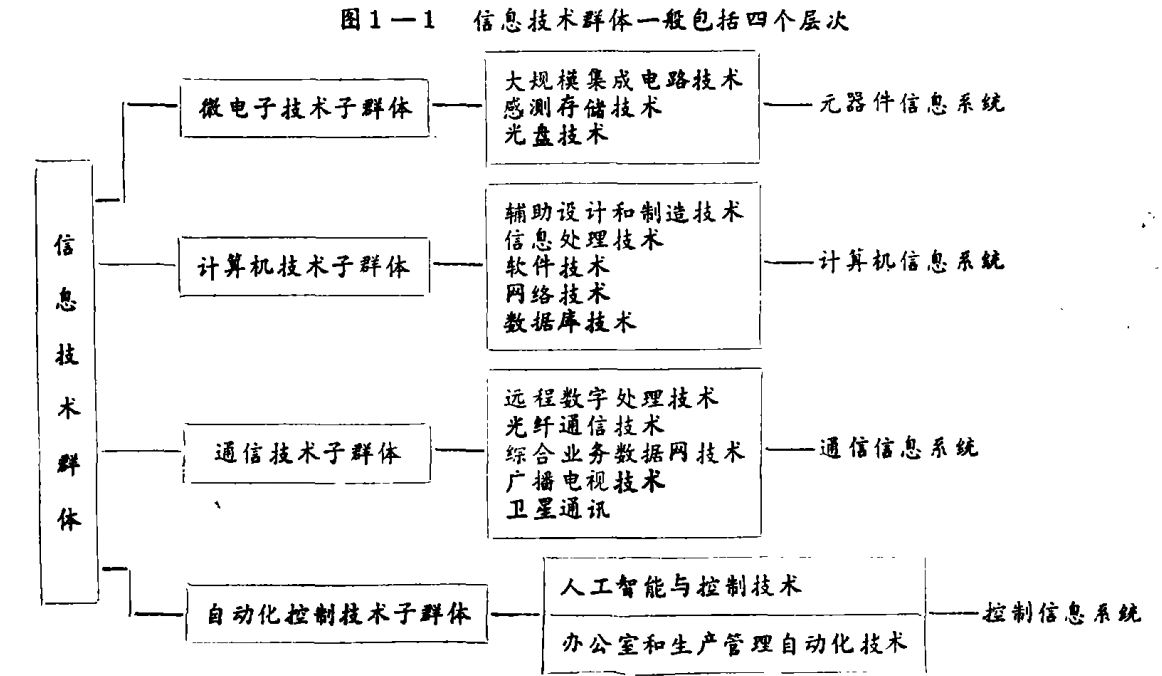 信息技术群体中,也包括高技术和新技术、传统技术之分。信息技术总体来论属于高级技术,而其中的内容不断更新,以致出现新技术群体,即指在一定时空范围内,初次出现的技术,或者对原有技术的改进和革新,在性能上有所突破。所有进步的技术,从广义上讲,它不仅包括各种新的工艺操作方法、新设备、新材料等方面,还应包括与之有关的新系统、新管理技术等现代化技术。新技术依时间的推移而变,在前一时期被认为是新技术,随着技术进步与发展,也会变成旧技术,并为更新的技术所代替。因此,信息技术群体的各组成技术都在不断改进,由低级向高级发展成长。当然,到一定程度有些技术也将被淘汰。从当前新技术革命的发展状况看,信息技术群体划分为三类。第一是产生于近40年到目前已经过时并将逐步淘汰的技术,如计算机技术中第一、二代计算机及其应用技术,半导体技术中的晶体管元器件等;第二类是已经成熟,逐步转向应用,有的正在实现产业化的技术,如光导纤维通讯技术,大规模及超大规模集成电路,卫星通讯,工业机器人,第三、四代电子计算机等等;第三类是目前正在积极研究和加紧开发,有希望在90年代末或21世纪初期投入应用并形成产业化的技术,如第五代电子计算机、光计算机、生物计算机、人工智能技术等等,这三类技术的划分是随时间而变的,也就是说,这种动态结构会依据实用化阶段的演变而改变。