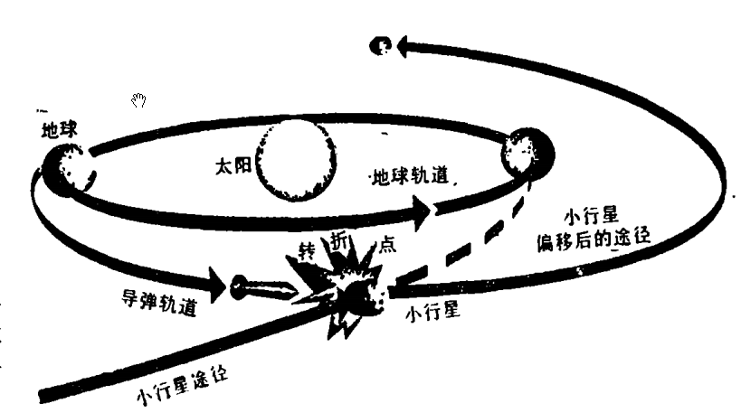 拦截小组认为 · 只要把现有的技术水平提高一步,防止撞击灾难的途径是确实存在的。基本的策略是:首先搜索这些威胁性的天体,然后发出装有弹头的导弹拦截爆炸,使其运行轨道发生偏移,进入新的轨道,从而无害地越离地球(见图)。
