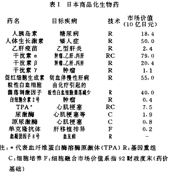 自从1986年1月第一批基因重组体药物,即用于治疗糖尿病的人体胰岛素,被投放市场以来,仅仅过了7年。但国内市场对生物药物(通过基因操作、细胞融合和细胞培养制成的药)的需求要到去年11月按药物价值基础已达2,771亿日元(见表1)。1993年,市场规模估计将升至3,000亿日元,生物药将占全部药物市场的50%。包括通过基因操作术、细胞培养和细胞融合术制成的药品在内生物药品达14种之多,并全都已经商品化。在目前阶段,这些生物药品主要是抗肿瘤药,但面临国内人口老年化的不断加剧,治疗心血管疾病如心肌梗塞的药品数量正在增多。除此之外,依靠生物技术正在开发抗病毒剂、小体增殖因子、血液衍生物(血液凝固因子和抗体)和各种激素。我们正在把希望寄托在研制出划时代药物,诸如治疗自我免疫性疾病、艾滋病和热带病上。