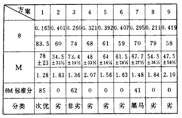 ①θ,第一行为实测值,第二行为百分制转换值。共43“票”,投票者为各所所长或所办公室主任,数据标准离差总平均17%,不大。两组结果大同小异,即7种方案极一致,2种方案在感觉上差“一个格子”。这样,感到方法可用,能如实反映问题。