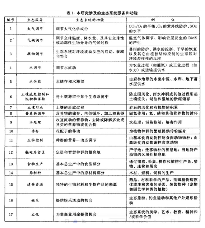 生态系统的功能所指的是生态系统之栖息地生物或系统的特性或过程。生态系统产品(如食物)和服务(如废物的吸收)代表着人群直接或间接地从生态系统功能那儿获得的利益。为简便起见,我们把生态产品和生态服务统称为生态服务。为了便于分析,我们把生态服务归纳成17个大类。这些门类列于表1。