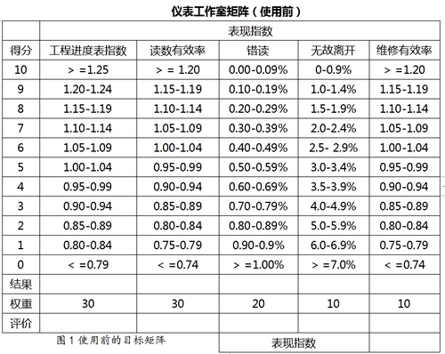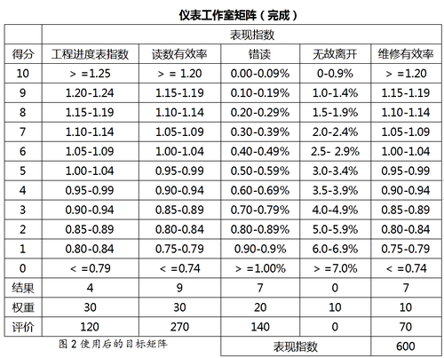 为了建立仪表工作室矩阵,我准备了该矩阵中各表现指数的可能结果,将每个指标的有代表性的结果列在得分为3的一行中。用这种方式设置典型表现防止了将高分给予一般的表现,并包含进了延伸工作力度至最佳表现的思想。在划分得分时,确保每项表现栏中的数量进级保证了相互不包含的空间也很重要。例如,在我们的矩阵中,“无故离开”中百分之2的结果得到7分,而百分之1.99得到8分。“权重”行中的数值反映了管理者对各点的考虑优先次序:对于仪表工作室“错读”被认为比“维修效率”更为重要,因而在最终指数中占了2倍于之的份量。