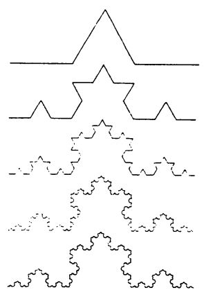 更为新近的著作是由数学家B · 门德尔布洛特(B. Mandelbrot)写的,它大大提高了我们对按比例作图在描述自然物体中的重要性的认识。他扩大对各种按比例现象的考察范围,整理出版了三本专著。第一本用法文写,1975年出版。其余两本延续到最近,用英文写,在旧金山出版。它对许多种完全不同的研究作了一个新的综合。在某种意义上说,那些研究除了遗忘的以外是无所不包了。它们都是有关高度不规则物体的数学描述的,不但包括所谓病理学几何物体,而且包括许多自然物体,如各国的海岸线(陆界)。由于那时没有发明出什么词汇来称呼这些物体,门德尔布洛特就创造了一个新名词——分形(fractals)来称呼它们。fractals是从拉丁字(形容词)fractus演变过来的,原意是不规则或碎片。门德尔布洛特的基本观念是:理解和表征分形物体的钥匙会在“维”的概念探索中找到。在他的著作中,他的确利用两种不同的维:浩斯多夫-贝锡柯维茨维d和拓扑维dt。后者常有一个整数值,是需要考虑把物体分成两部分时用切割的形式来定义的。如果切割处是平而,物体是3维的;如果切割处是一条线,则物体是2维的;如果切割处是点,物体就是1维的。对于平滑的规则物体,他用的2维是与欧几巫得维dE相同的。而对于分形物体,它们可以区分并满足一般关系式: