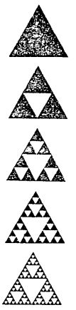 分数维的概念最先是在德国数学家F · 浩斯多夫(F. Hausdoff)的著作里(1919)提出的。几年之后,由A · 贝锡柯维支(A. Besicovitch)作了实质性的推广。这个概念适合于描述高度不规则物体,我们只在这里指出它是怎样定义直线和三角形的。设想把一条直线平分成三段,删去中间一段,再用两条等长的直线来代替它,形成一等边三角形。可以任意次连续重复这样的步骤,(见图1)。就三角形来说,我们设想它被接连分成越来越小的恒等三角形,这些三角形恰好盖住原来三角形的面积,这一过程见图2。直线的运作产生了房柯胥(Von Koch)雪花;三角形叫锡尔宾斯基(Sierpinsky)垫片。两种几何物体都具有“自相似”的性质——即直线和三角形的亚分总是产生与初始物体几何形状相似的物体。浩斯多夫用下面的关系式来定义这种物体的维数d: