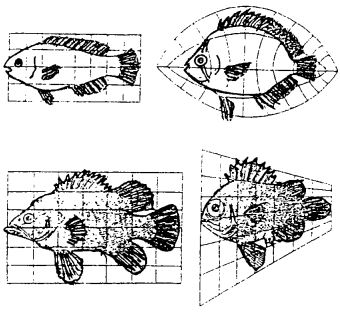 任凭这件事情的戏剧性曲折,有一本探讨欧氏几何在表征自然界中的作用的书在1917年出版了。著者D · A · 汤普生(D. A. Thompson),书名《生长和形态》,其意义非同小可;它至今仍在刊行。S · J · 高德(S. J. Gould)说它是“20世纪科学作品中最伟大的散文体著作。”汤普生基本上是一个动物学家,他的观点是,“世界的和谐是从‘形态’上表现出来的.........心灵和一切‘自然哲学’的诗篇全都体现在数学美的概念里。”虽然汤普生的研究工作以欧几里得为基础,但是他还是想扩展对欧氏的研究来达到他自己的特定目标。因此,他就从等边三角形开始,按比例尺制成比较大的和比较小的相似三角形;他能导出一系列的旋转曲线,用它们来模拟诸如海贝和兽角之类的东西。也许让汤普生最难忘怀的是他用坐标系来描绘各种各样的动物种族。他用不同方法让坐标系变形,以形成新的描绘,使它看起来明显像别的熟悉的动物种族。图3是一些鱼类的例子。汤普生曾经指出,按比例制图在大自然是重要的,尽管它的几何图形只是粗略地近似于现实。他说,无生命物体的“美丽多姿比起让我们倾慕的有生命物体来是毫不逊色的。海浪,山峦的轮廓,云层的形状,凡此种种,有着那么多的形态之谜!”