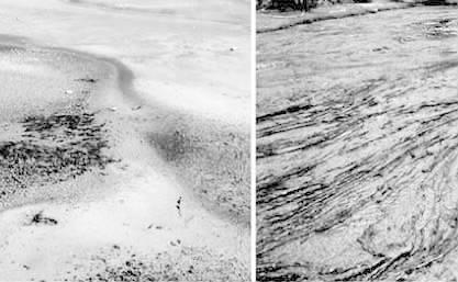 图1.黄石国家公园充满了很多不同寻常的只有用显微镜才能看到的生命,如嗜热藻类和丝状细菌(右下图)。这些生物往往会形成生物膜,这对大自然摄影师的眼睛来说或许是显而易见的,但我们还不能很好地了解它们。尽管早在17世纪微生物的生物膜就被发现,但科学家们将大部分精力集中在微生物的单生或浮游生物的形式上。不过,实际上大多数微生物都是以较大的群落生活在一起,连在一个表面上的。这种生活方式深深影响了它们与其他生物的相互作用,以及它们作为病原体的“弹力”。对生物膜的新的研究可能会改变微生物学研究的方向——有希望控制住由细菌和其他微生物引起的传染。
