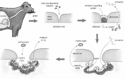 这些酸性的代谢物正常情况下将通过反馈抑制过程使一些细菌生长变慢,不过其他的微生物会加入到生物膜群落中来吃掉有机酸。例如产甲烷菌和古细菌,它们的行为会加速细菌群落的生长和阻止反馈抑制。顾名思义,产甲烷菌会产生甲烷——而且是大量的甲烷。每年全球释放的甲烷中大约15~25%(总计75亿千克)可归于反刍动物的肠胃气胀!因为甲烷可以捕获大气中的热,所以隐藏在牛胃中的生物膜或许在全球气候变化中起到了非凡的作用。