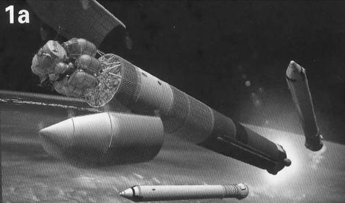 用于发射CEV的火箭还是沿用在航天飞机上建功立业的高可靠性技术。发射登月舱的大型火箭用了5台航天飞机的主发动机,左右各配置(捆绑)1个固体燃料火箭助推器,其发射能力达到120吨。发射载人舱的火箭第一级用了1个航天飞机的固体燃料火箭助推器,第二级用了一台航天飞机的主发动机。