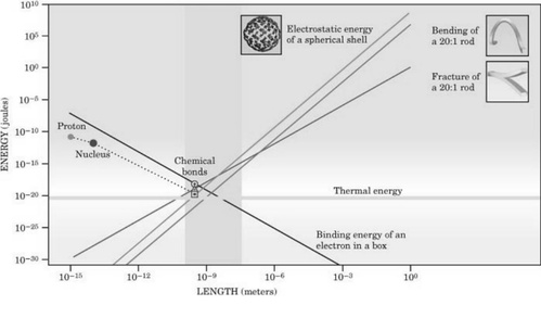 图2. 能量的汇合在该图得到显示,热能、化学能、机械能,还有随物体规模而定的静电能。由于典型的物体根据大小排列靠近,所有的能量都汇集到一起。水平线显示了热能大小以KT计,当然并不依据物体大小规模。为方便比较,图中显示了氢结合下的有规则的结合能,三磷酸腺苷中的磷酸盐组,共原子结合(环),还有典型的原子和亚原子能。
