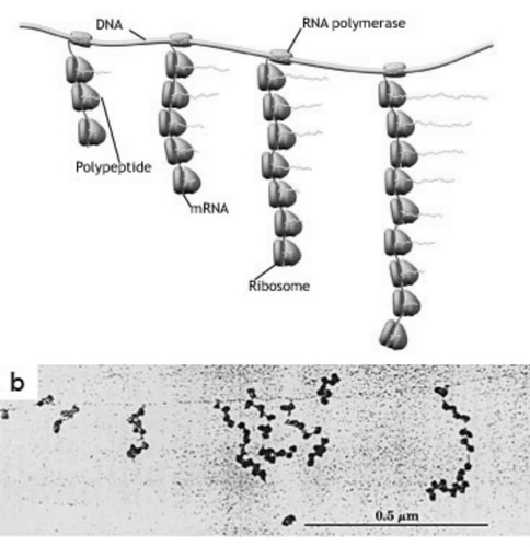 图3. 协同作用中大肠埃希菌中的分子机器。在草图中,转录过程中RNA聚合酶移动到DNA右侧并且缠绕在信使RNA上。同时,分子机器参与翻译:核糖体沿着RNA移动并且制造多肽。最后,那些多肽将组成蛋白质。(b)转录和翻译同时发生的电子显微镜照片。