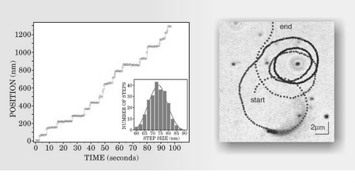 图4. 生物体轨道能被精确测量。左图为单一分子发动机阻凝蛋白作为计时功能时的位置,能通过检测依附于发动机的分子荧光强度加以确定。右图为等时步骤在利斯特菌轨道中得到显示和细菌把主体细胞构建成肌动蛋白网络。