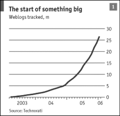 “如果你想对一个问题的争辩并产生共鸣的话,那么通过博客即可”,雅虎的杰里米 · 扎沃德(Jeremy Zawodny)如是说。仅仅在几年前,这样的争辩会很简短,以致其中的部分人通过博客互相结识并能达成一致的定义。博客搜索引擎Technorati显示,在今天,每秒钟会有一个新的博客产生,每5个月其数量就会翻一番(见表)。从年轻人到公司执行官,他们有各自的理由与兴趣参与到博客的行列中。