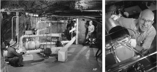 左图为1967年戴维斯(右)和同事盖哈特 · 弗瑞兰德(Gerhardt Friedlander)在霍姆斯塔克(Homestake)金矿下的中微子探测装置的泵房内。正是通过这个深埋地底的探测器,戴维斯在30多年里探测到来自太阳的约2000个中微子,并终于在2002年获得了诺贝尔物理学奖。右图为晚年的戴维斯。
