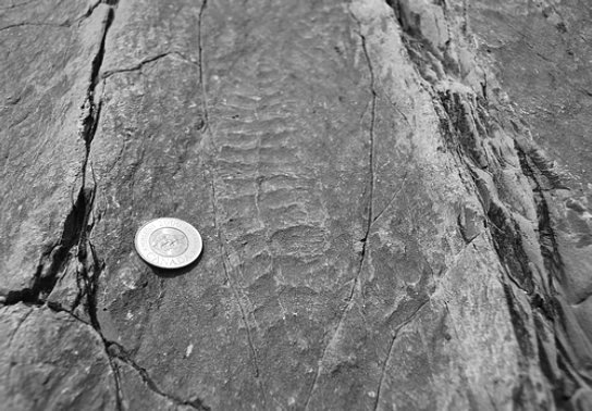 在浓雾中摸索前进了45分钟,我们到达一片巨大的伸向海中的黑色板块构造上,随后小心翼翼地爬下岩面,站在一块由页岩形成的天然陡坡前。这里保存着曾生活在地球上最早的复杂生物的“留影”。