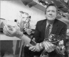 也许需要组合使用这些方法以提供最自然的控制和反馈机制,哈什巴格希望将上述所有的方式挖掘到极限。与期望使用者学习如何控制仿生臂相比,哈什巴格则希望借助电子装置推算出使用者想要做的动作。他说:“我们不希望用户去学习一套新的激活肌肉的方式来控制仿生臂。”到目前为止,沙利文已经能够很自然地把帽子戴在头上。哈什巴格表示,他为沙利文设想的下一个目标是学习打字,他边说边比划着:“就这样,更像我打字的方库肯手持自己研制的仿生臂式。”