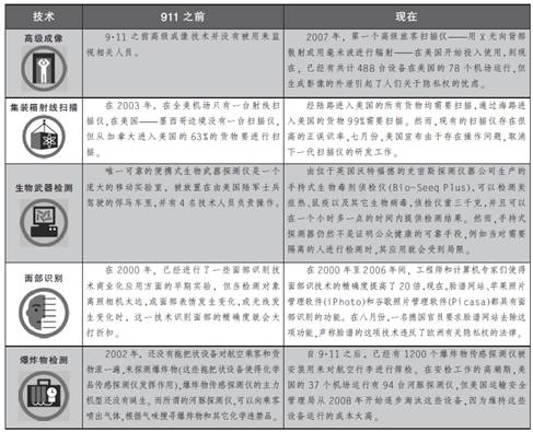 2001年9月11日发生的恐怖袭击使得美国对于安检工作变得异常敏感,表现之一就是新监控技术――10年之后这些技术产生的效果喜忧参半――的广泛运用。尽管用来检测进口货物的射线监控设备已经被大批部署,但它们的作用仍然令人怀疑。而其它的技术――例如美国运输安全管理局(TSA)应用的航空乘客成像仪――似乎能够发挥作用并且应用日益普遍,但它使一些人产生一种失去自尊的感觉。下面,我们对五项技术在9·11之前和现在的状况进行比较。