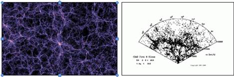 目前理论上的宇宙图,右图为CfA1989年观测到的星系长城
