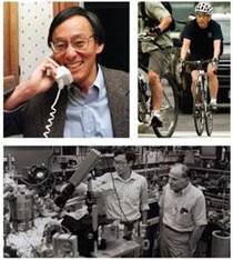 诺贝尔奖获得者朱棣文在呼吁(左),在LBNL工作期间,他总是骑自行车上下班(右),下图为朱棣文在贝尔实验室工作时的留影