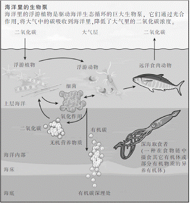 第二,浮游植物的残骸、海洋生物的排泄物,以及其他海洋生物死亡后的遗骸会慢慢下沉到500米以下的深海,在那一片寒冷黑暗的水域中,食腐动物和微生物将这些有机物质分解成各种化学成分。由于深海的水体很少与漂浮在上层的温暖水体产生混合,二氧化碳和其他简单的营养素都将被储存在深海里。深海环流循环缓慢,在经历几个世纪的漫长时间,才有机会将富含二氧化碳的海水循环到海洋表层,再返回到大气中。与此同时,上层海洋的生物泵在历时几百年才能发生作用,将二氧化碳传递到深海中。