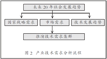 运用情景分析方法,围绕国家未来20年社会发展趋势,分析在这些情境下某产业技术需求情况;从国家战略角度分析国家对该项产业技术的需求情况;从市场需求和技术发展趋势的角度分析对该项产业技术的需求情况,确定技术需求课题清单;执行技术需求集群战略,技术集群战略既不会损失单个独立的中小企业所具备的创新行为优势,又可以获得大企业才拥有的创新资源优势,从而达到创新活力和创新规模经济性的有机结合,推演技术需求集群。产业技术需求分析流程见图2。