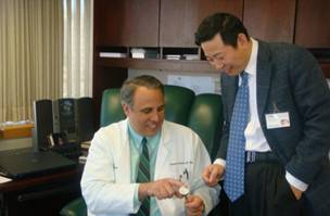 王金武(右)2008年在美国克里夫兰医学中心与担任美国肩肘关节学会主席约瑟夫·安诺蒂 教授一起研究肩关节假体设计