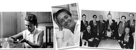 丽塔50年代(左图)和60年代(中图)在华盛顿大学时的照片;1986年,她和斯坦利.科恩(分坐于桌子两边)获得诺贝尔医学奖