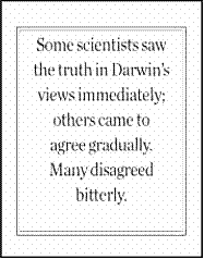 有些科学家(比如生物学家老赫胥黎),很快就认可了达尔文的观点,而有些人则是渐渐接受的。当然,还有一些持强烈反对态度的人,他们攻击达尔文和达尔文的著作。但是大多数的进化论反对者,即使时至今日,也举不出什么反对的证据来。比如,化石记录缺失某些环节?这是可以想象到的,达尔文解释道,因为地质学的记录也是不完整的。