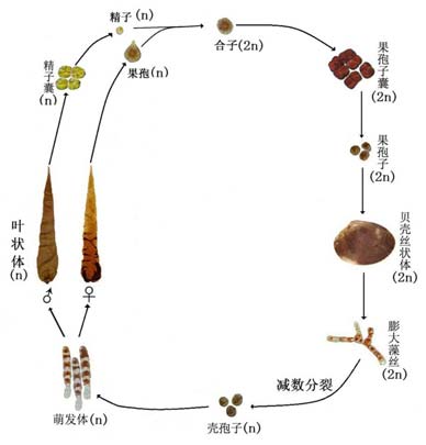 雌性生殖细胞为果孢,雄性生殖细胞为精子,二者结合后,经过多次分裂形成果孢子囊,成熟后的果孢子脱离母体释放于海水中;