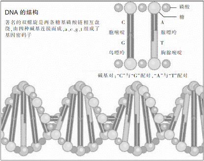 对DNA的操作,是由其本身的结构所决定。双螺旋阶梯的每一级都是由一对DNA碱基组成,其碱基分别由A(腺嘌呤)、T(胸腺嘧啶)、C(胞嘧啶)、G(鸟嘌呤)四个字母代表:A只能与T配对,而C只能与G配对。如果把阶梯一分为二,把原来配对的梯级分开,那么每一半阶梯都会含有补全另一半的全部信息。因此,你可以从一个DNA分子制造出两个独立的DNA分子。这一过程此刻就在你身体里进行着(构成身体的细胞以大约每分钟3 000个字母速度分裂,细菌则以10倍于此的速度进行)。相同的过程在地球上的每个细胞中连续不断地进行。据我们所知,活细胞中的DNA都是一样的,联系达尔文的进化论学说,我们能勾勒出生物的基本图形以及生命在40亿年的过程中是如何进化的。