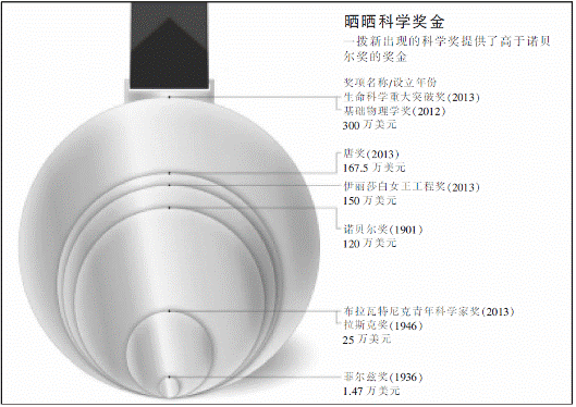 生命科学领域的重大突破奖在今年2月份公布,也是米尔纳发起的――但是这次,他让朋友和同事包括扎克伯格以及沃西基和布林夫妇也入伙了。他们将3 300万美元奖金平均分配给11个获奖者,并且承诺每年新增5个奖金300万美元的奖项。“我们都有科学背景,尽管我们不都是最好的学生,”沃西基说,“设立这个奖是让我们重新和科学连在一起并且有所回报的一种途径。”3月份,英国颁发了100万英镑(折合150万美元)的伊丽莎白女王工程奖,奖金来自企业赞助的慈善捐款,由英国皇家工程院设立,目的显而易见是为了让工程师一尝诺奖带来的荣耀和奖赏。