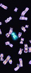 9号染色体(正中)的一部分与22号染色体的易位,产生了费城染色体