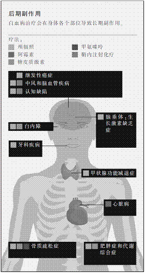 如今,许多白血病的病例都是可治愈的:超过85%的小儿急性淋巴细胞白血病(ALL)患者都幸存下来了,ALL是最常见的小儿白血病。但是超过1/4的小儿癌症幸存者在接受治疗之后的起初25年里,报告了至少是严重的、威胁到生命的或是致残的健康状况。