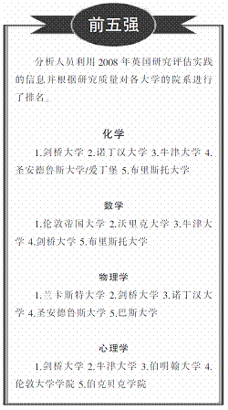 英国政府利用这个评估的结果来向大学分配每年超过16亿英镑(约合26亿美元)的项目经费。这些经费的70%以上都被那些排名前20左右的大学拿走了――去年(2012年),牛津大学得到了超过1.3亿英镑的与研究质量相关的经费――然而,那些最小的、研究能力最差的科研机构只能靠几万英镑勉强度日。这些评估结果被迫不及待地整合成一个排名榜,而该排名榜则显示了哪些大学在哪些学科中科研能力最强(见“前五强”)。