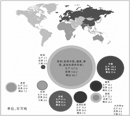 世界主要的大米生产国种植的大米足以喂饱他们自己的人民还过剩。过剩的大米就用来出口、饲养牲畜、育种库存或浪费掉了(在运输或储存过程中坏掉)。数据显示了2007-2011年平均每年生产和消费的大米数量。