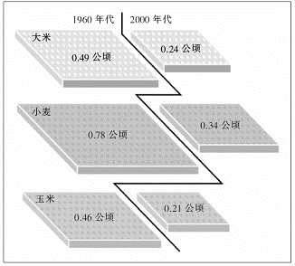 改良过的稻米品种和现代农业技术,意味着农民在更小的土地面积上能产出更高的稻米产量。数据显示了生产1吨粮食平均所需的土地面积。