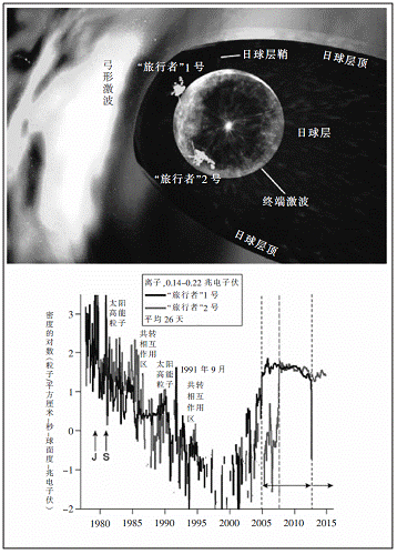 1977年发射升空,迄今已在太空运行了长达38年的“旅行者”1号、2号探测器,它们的空间探测任务具有划时代的意义:前者实现的任务远远超出了初期目标,并在继续它的发现之旅(日球层顶外环境目前仍然未知,随着探测器的运行,将会揭示出更多的新现象);后者目前位于108个天文单位、黄道以南31度,正在日球层顶区域探测,其一台正在工作的等离子体装置,或将回答“旅行者”1号给出的一些问题,例如,银河系等离子体的温度和方向流及弓形激波存在的原因。