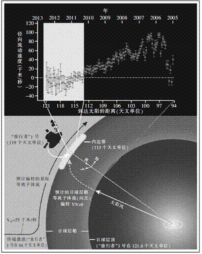 当“旅行者”1号深入到日球层鞘时,T分量仍然很小且相对是个常数,其值从-20至-40千米/秒,而R分量在97个天文单位处达到100千米/秒峰值,随后便减小到113个天文单位处的0千米/秒。这种变化本身并不奇怪,因为径向速度在日球层顶处应该为0。然而,“旅行者”1号却在远离日球层顶2个天文单位处测量到的速度仍为0(从115到121个天文单位范围中,速度是波动的,但其平均值在-15千米/秒)。换句话说,这显示了日球层鞘等离子体是以某种方式同流入的局部星际介质等离子体发生了耦合。