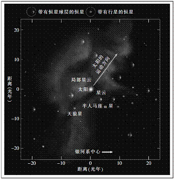 图6.由天文观测推测出的太阳系相对于局部星际介质的运动。这幅图显示了带有恒星球层(相对于太阳的日球层)的已知恒星。“旅行者”途经日球层能够告诉我们更多关于宇宙空间更广泛区域的构成