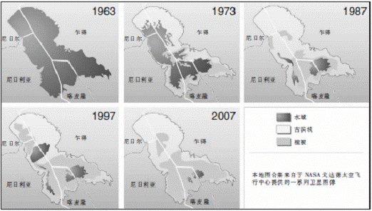 乍得湖一直是湖岸四个国家的“母亲湖”,为周围的千万居民提供饮用和灌溉水源。然而近50年来,由于受气候变化和人类活动的影响,乍得湖流域的水文和生物物理学过程发生了很大的改变,导致湖面不断萎缩,湖床变得浅平宽广,整个盆地内的各种自然资源遭到破坏,流域内生物赖以生存的生态系统受到威胁,环境与安全问题频现,对内外部冲击和压力的反应越来越脆弱。