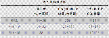 注:昆虫和肉类替代品提供的蛋白质与牛肉类似,但它们的全球变暖潜能值要低得多