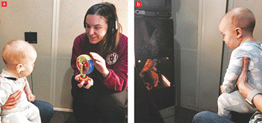 图2 小隔间里的婴儿 在一个减噪的小隔间里,参与实验的婴儿坐在一名看护者的腿上。a.一位助理人员用玩具使婴儿保持专注并面朝恰当的方向。婴儿通过入耳式耳机听旋律,但没有人听到婴儿在听什么――看护者听音乐,助理人员则接收隔间外的一名实验者的指示。实验人员通过观察婴儿的行为来判断是否向其播放了变化的旋律。婴儿常见的反应包括转动头部,或是把目光投向之前在调节阶段使用过的一个机械玩具。b.成年参与者独自坐在隔间里。婴儿没有被给予口头指令,成人获得的也只有模糊的指令“听到使玩具激活的变化旋律的时候,就举起手。”除此之外,婴儿和成人接受的测试一样